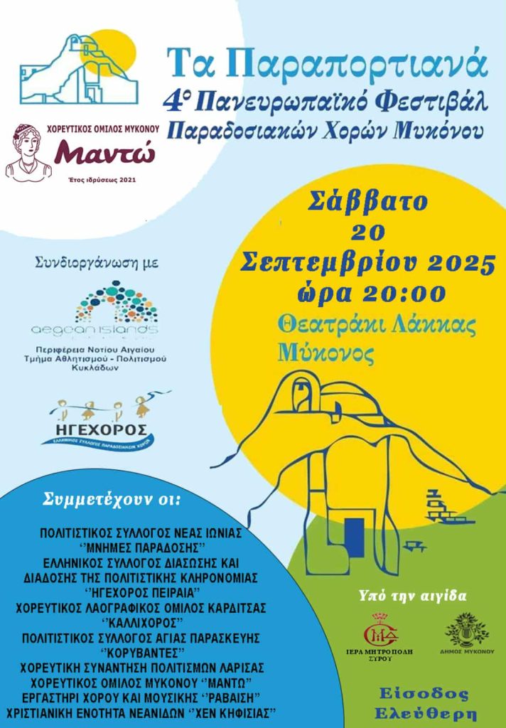 Στο πλαίσιο αυτής της πολιτιστικής πορείας, ο Όμιλος «Μαντώ» διοργανώνει το 4ο Πανευρωπαϊκό Φεστιβάλ Παραδοσιακών Χορών «Τα Παραπορτιανά» και σας προσκαλεί σε μια μοναδική βραδιά αφιερωμένη στην παράδοση, τον χορό και τον πολιτισμό!