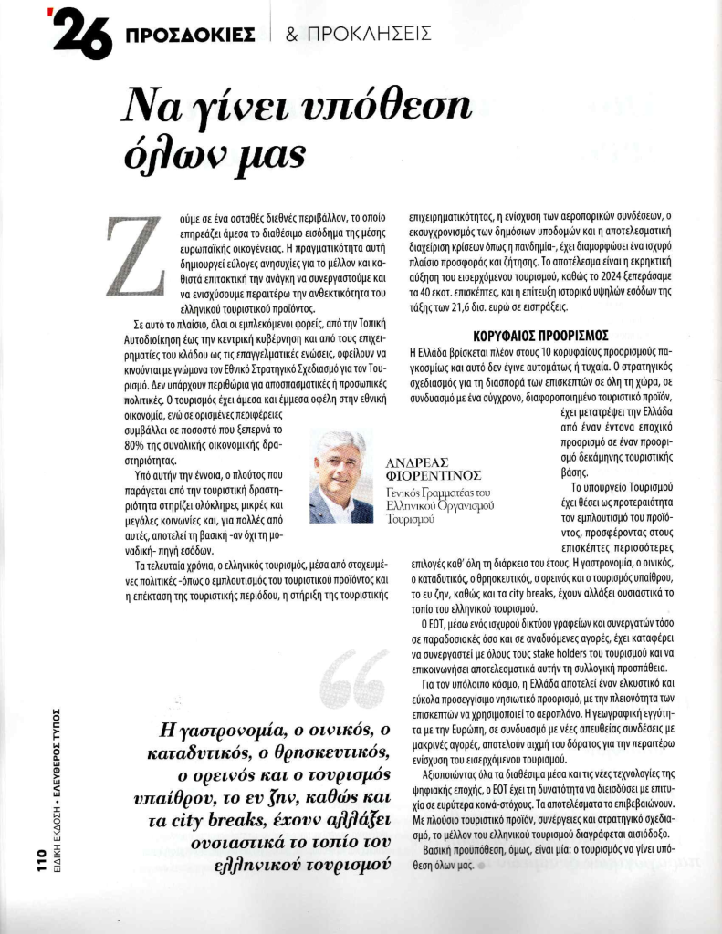 Ο Ανδρέας Φιορεντίνος, Γενικός Γραμματέας του Ελληνικού Οργανισμού Τουρισμού, μίλησε στον “Ελεύθερο τύπο” για τον τουρισμό και την θέση της Ελλάδας σε αυτόν. Δείτε αναλυτικά τις δηλώσεις του όπως εκδόθηκαν στην 110 ειδική έκδοση του Ελεύθερου Τύπου, στην ενότητα “προσδοκίες και προκλήσεις” :