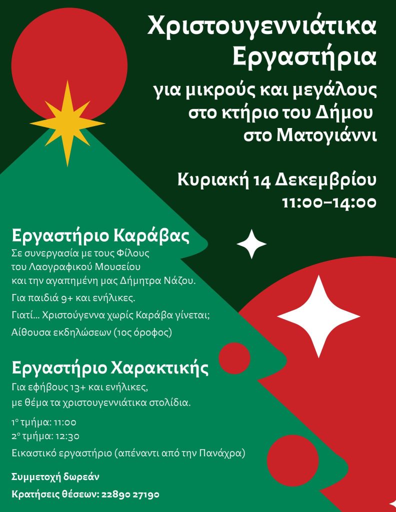 Σας προσκαλούμε σε μια δημιουργική χριστουγεννιάτικη Κυριακή, γεμάτη φαντασία, παράδοση και τέχνη, στο κτήριο του Δήμου στο Ματογιάννι.