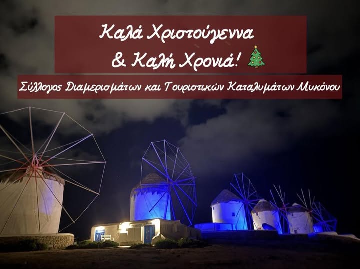 Με μια όμορφη απεικόνιση των φωτιζόμενων Μύλων της Μυκόνου θέλησε να δώσει τις ευχές του ο Σύλλογος Διαμερισμάτων και Τουριστικών Καταλυμάτων Μυκόνου.