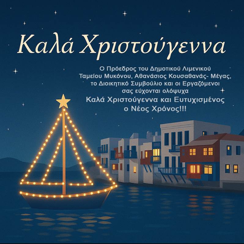 ΔΗΜΟΣΜΥΚΟΝΟΣ Ευχές του Δημοτικού Λιμενικού Ταμείου Μυκόνου για καλά Χριστούγεννα By nickpapoutsas December 19, 2025 Το Δημοτικό Λιμενικό Ταμείο Μυκόνου σας εύχεται Καλά Χριστούγεννα και Ευτυχισμένος ο Νέος Χρόνος. Εικόνα εγκατάλειψης στο Αεροδρόμιο – Εκθέτει τη Μύκονο στους επισκέπτες Μάρκος Καφούρος: Αναγκαία η ενίσχυση αστυνομικών και λιμενικών υπηρεσιών στις Κυκλάδες Με λαμπρότητα η Κυριακή του Αντιπάσχα στη Μύκονο στον Άγιο Αρτέμιο Καιρός στη Μύκονο: Αναλυτική Πρόγνωση για τη Δευτέρα Σύλλογος Καρκινοπαθών Μυκόνου: Δωρεάν εξετάσεις από εξειδικευμένους γιατρούς για το μελάνωμα και τον μαστό «Emily in Paris» και Ελλάδα: Η Μύκονος στο κάδρο για τη νέα σεζόν ΠροηγούμενοΡεκόρ πληρωμών το 2025 για τα Σχέδια Βελτίωσης και νέα επενδυτικά προγράμματα άνω των 500 εκατ. ευρώΕπόμενοΟι μαθητές του 1ου Δημοτικού Σχολείου έψαλλαν τα κάλαντα στη Μητρόπολη Μυκόνου TagsΔΗΜΟΣΜΥΚΟΝΟΣ ΔΕΙΤΕ ΕΠΙΣΗΣ Καιρός στη Μύκονο: Αναλυτική Πρόγνωση για τη Δευτέρα Με βελτιωμένες καιρικές συνθήκες και ανοιξιάτικη διάθεση ξεκινά η εβδομάδα στο νησί των ανέμων. Σύμφωνα με τα... Αμερικανός πρεσβευτής: Δεν αναφέρομαι στα θέματα Ελλάδας-Τουρκίας, θα μου... Για τις προσπάθειες της Τουρκίας να ξεμπλοκάρει το θέμα των F35 μίλησε στη διάρκεια του Φόρουμ της... Ο καιρός στη Μύκονο: Η πρόγνωση της Τρίτης Συννεφιασμένο αναμένεται το σκηνικό του καιρού στη Μύκονο για την Τρίτη 14/04. Παρά την απουσία έντονων φαινομένων,... Πάσχα 2026 στη Μύκονο: Πλήθος κόσμου, κατανυκτικές στιγμές και... Η Μύκονος έχει έναν τρόπο να αλλάζει τελείως πρόσωπο το Πάσχα. Όχι απότομα, αλλά σταδιακά. Από τις... Κυκλάδες: Έρχεται «κόφτης» έως 30% στις τουριστικές κλίνες και... Σε φάση τελικής επεξεργασίας βρίσκεται το νέο Ειδικό Χωροταξικό Πλαίσιο για τον Τουρισμό, με την κυβέρνηση να...