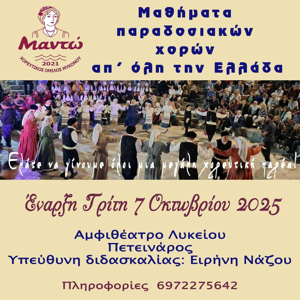ΜΥΚΟΝΟΣΠΟΛΙΤΙΣΜΟΣ Έναρξη μαθημάτων για τον Χορευτικό Όμιλο “Μαντώ” By nickpapoutsas September 28, 2025 Η Έναρξη των μαθημάτων θα γίνει την Τρίτη 7 Οκτωβρίου στο Αμφιθέατρο του Λυκείου στον Πετεινάρο. Πανήγυρις Ζωοδόχου Πηγής στην Άνω Μερά – Το πρόγραμμα των εορτασμών Στη Μύκονο το 37ο EUPEA Forum για τη Φυσική Αγωγή και τη Συμπερίληψη «Emily in Paris» και Ελλάδα: Η Μύκονος στο κάδρο για τη νέα σεζόν Πόσο επηρεάζεται η Μύκονος από τον πόλεμο στη Μέση Ανατολή – Τι δείχνουν τα στοιχεία Ελληνικός τουρισμός: Οι τρεις καθοριστικοί παράγοντες για το 2026 – Στο 21% η συνολική συνεισφορά στο ΑΕΠ πέρυσι UBS: Οι Έλληνες είναι οι πιο σκληρά εργαζόμενοι στον ανεπτυγμένο κόσμο ΠροηγούμενοΠΡΟΓΡΑΜΜΑ TVΕπόμενοΗ Μύκονος θα συνεχίσει να είναι φάρος τουρισμού και πολιτισμού TagsΜΥΚΟΝΟΣΠΟΛΙΤΙΣΜΟΣ ΔΕΙΤΕ ΕΠΙΣΗΣ Φλώριος Ασημομύτης: Η ένταση στη Μέση Ανατολή στρέφει το... ✒️ Άρθρο γνώμης του επιχειρηματία Φλώριου Ασημομύτη Η νέα περίοδος έντασης που διαμορφώνεται στη Μέση Ανατολή και το... Επιμελητήριο Κυκλάδων: Σεμινάρια Τεχνικού Ασφαλείας για εργοδότες Σε εξέλιξη μπαίνει ο προγραμματισμός των σεμιναρίων Τεχνικού Ασφαλείας για εργοδότες, που θα πραγματοποιηθούν στις Κυκλάδες μέσα... Κέντρο Υγείας Μυκόνου: Μια δημόσια δομή που στάθηκε στο... Ο κομβικός ρόλος της προέδρου της Διοικούσας Επιτροπής, Ντίνας Σαμψούνη. Η πορεία του Κέντρου Υγείας δεν υπήρξε εύκολη.... Έκοψε βασιλόπιτα ο Σύλλογος Εκπαιδευτικών στο Γενικό Λύκειο Μυκόνου Σε ζεστό και εορταστικό κλίμα πραγματοποιήθηκε η ευλογία της βασιλόπιτας του Συλλόγου Εκπαιδευτικών στο Γενικό Λύκειο Μυκόνου.... Καιρός: Η πρόγνωση για τη Μύκονο για σήμερα Τετάρτη Η Τετάρτη στη Μύκονο κυλά με καλό καιρό. Η νύχτα και το ξημέρωμα έχουν λίγες νεφώσεις, αλλά...