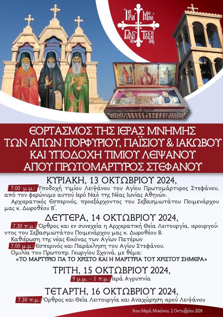 Στην Ιερά Μονή Παναγίας Τουρλιανής θα πραγματοποιηθεί ο εορτασμός των Άγιων Πορφυρίου, Παίσιου και Ιακώβου καθώς και η υποδοχή τίμιου Λείψανου του Αγίου Πρωτομάρτυρος Στέφανου.
