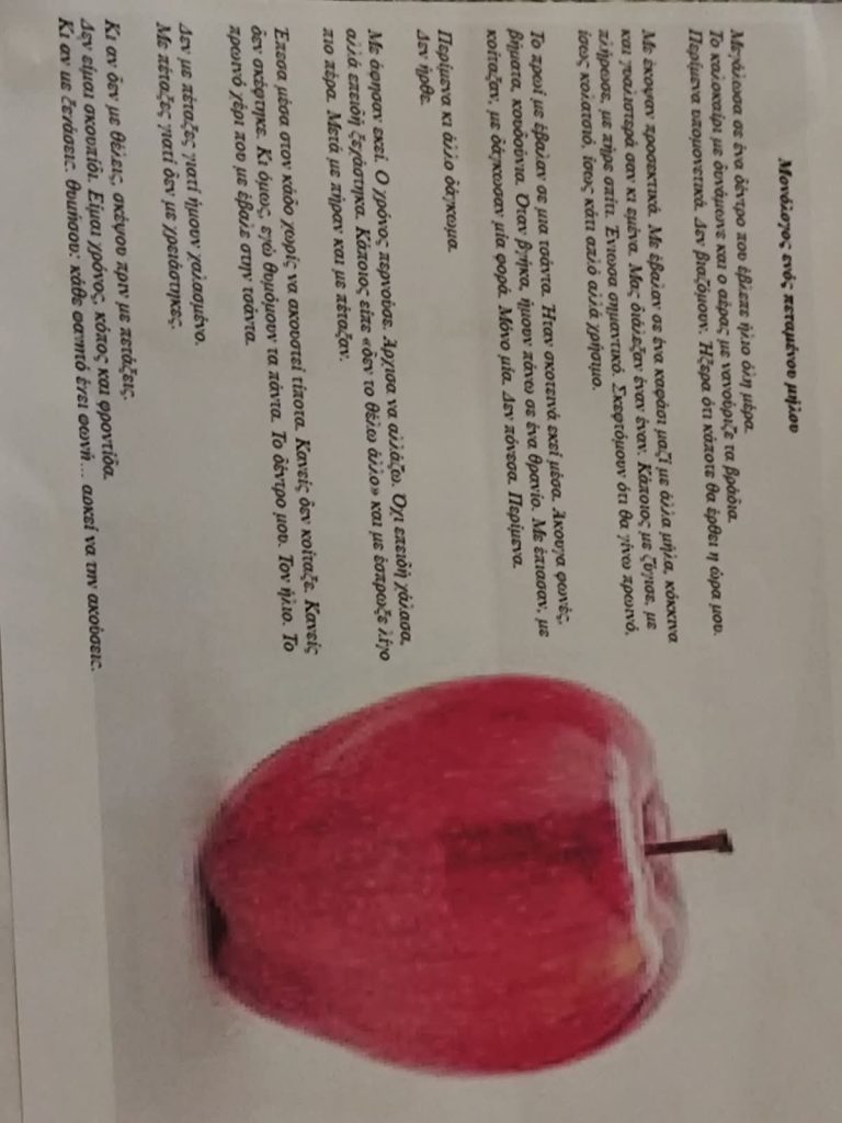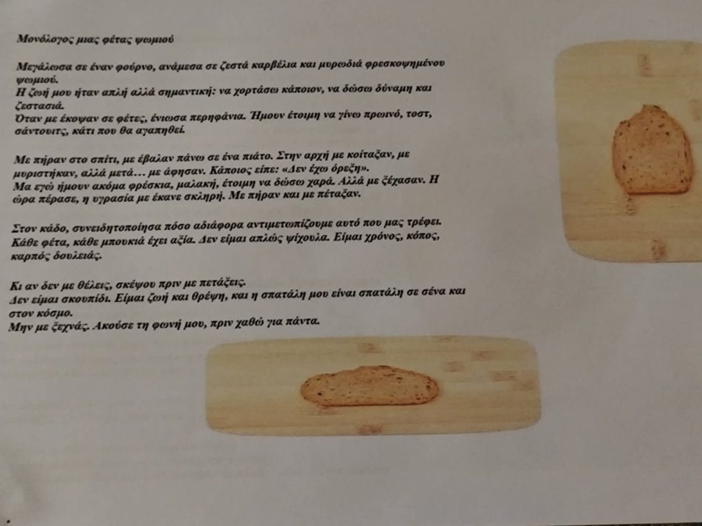 -Οι μαθητές παρουσίασαν θεατρικά δρώμενα βασισμένα στον «Μονόλογο» μιας φέτας ψωμιού και ενός πεταμένου μήλου, με στόχο την ευαισθητοποίηση για τη σπατάλη τροφίμων.