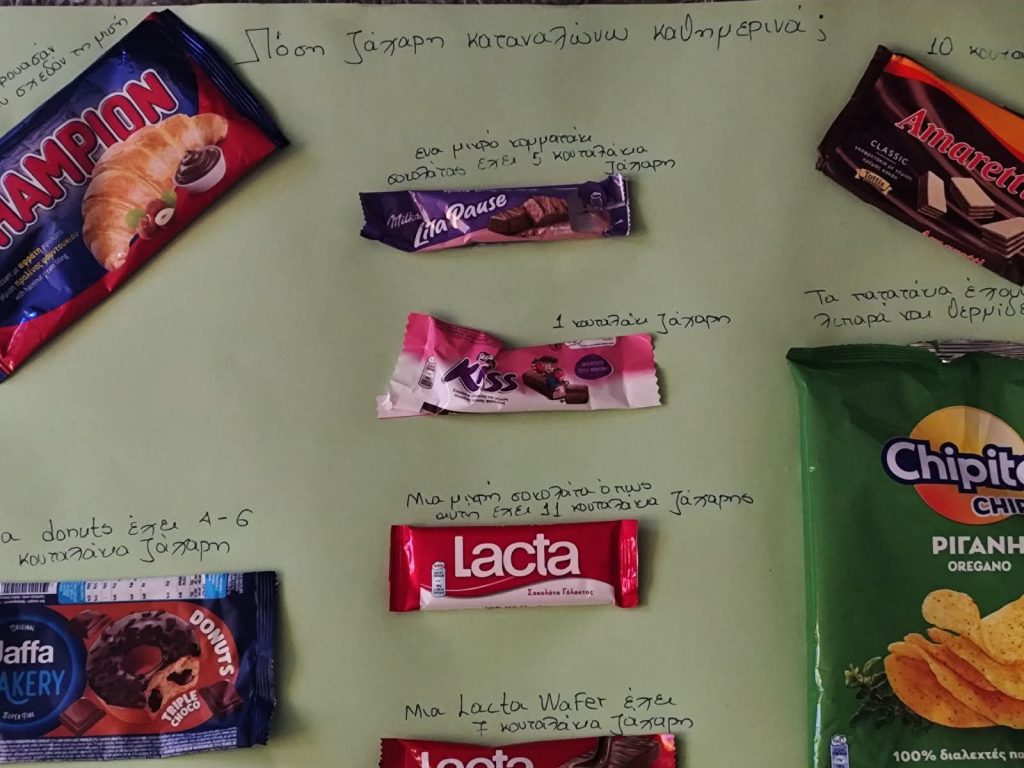 -Δημιουργήσαμε κολάζ με τίτλο «Πόση ζάχαρη καταναλώνω καθημερινά;», αναδεικνύοντας την επίδραση της υπερκατανάλωσης ζάχαρης στην καθημερινή μας διατροφή.