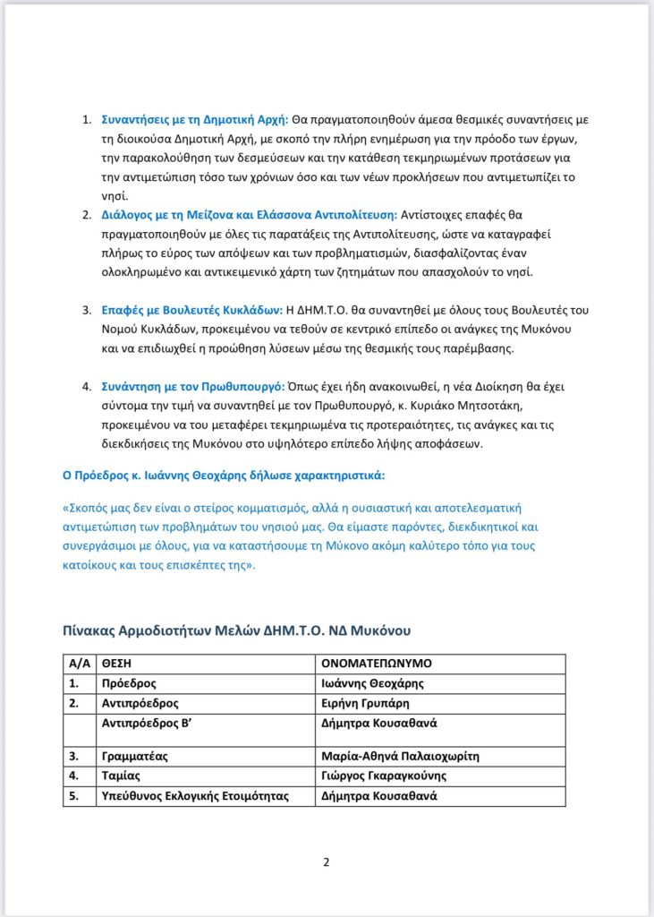 Η Δημοτική Τοπική Οργάνωση (Δημ.Τ.Ο.) της Νέας Δημοκρατίας Μυκόνου, η οποία αναδείχθηκε μέσα από τις πρόσφατες εσωκομματικές διαδικασίες, συγκροτήθηκε σε σώμα και προχώρησε στον σαφή προσδιορισμό των αρμοδιοτήτων των μελών της, εγκαινιάζοντας μια νέα εποχή εντατικοποιημένης δράσης, θεσμικής ευθύνης και αποτελεσματικότερης διεκδίκησης για την αντιμετώπιση τον προκλήσεων που αφορούν το νησί.