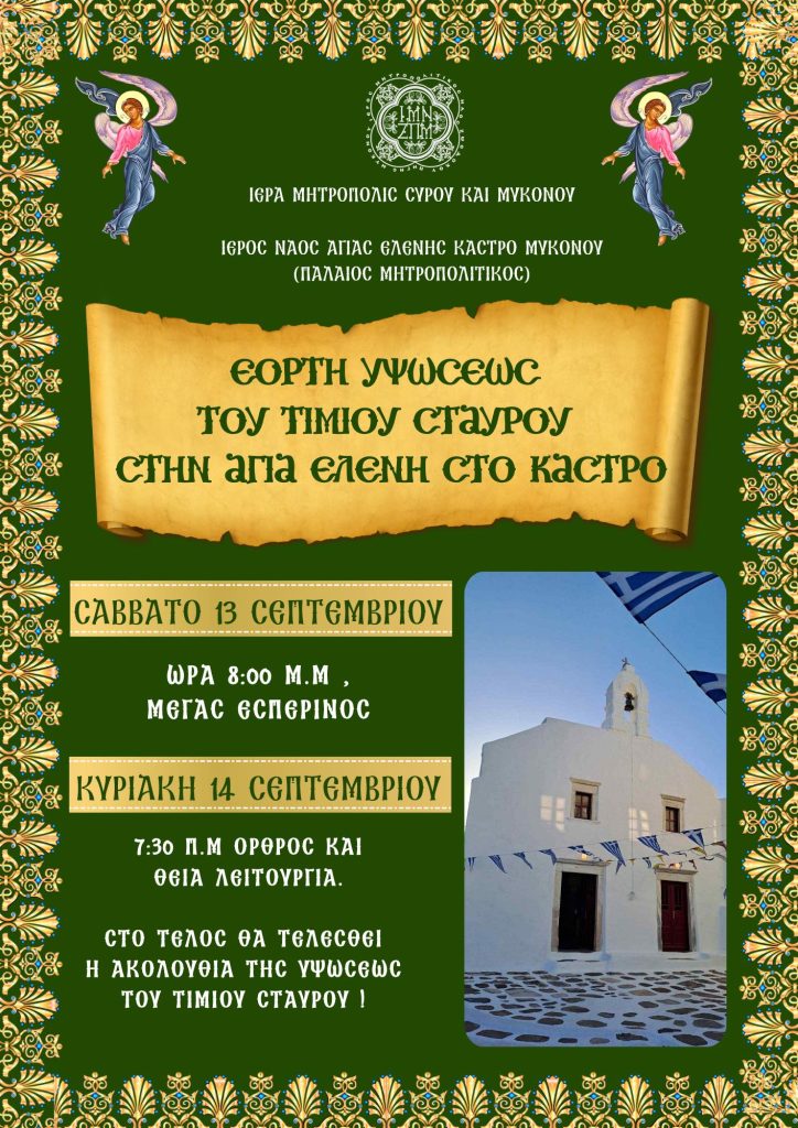 To πρόγραμμα των ιερών ακολουθιών: το ΣΑΒΒΑΤΟ 13 Σεπτεμβρίου στις 8.00μ.μ. θα τελέσουμε τον πανηγυρικό Εσπερινό! Την ΚΥΡΙΑΚΗ 14 Σεπτεμβρίου στις 7.30 π.μ. ο Όρθρος και η Θ. Λειτουργία.