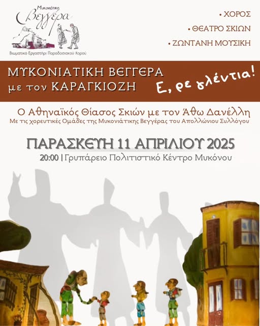 Την Παρασκευή 11 Απριλίου 2025 στις 20.00 στο Γρυπάρειο Πολιτιστικό Κέντρο Μυκόνου για μια πολύ ξεχωριστή βραδιά με τις χορευτικές ομάδες της Μυκονιάτικης Βεγγέρας του Απολλωνίου Συλλόγου.