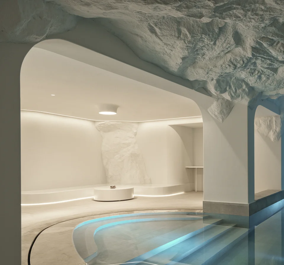 Ορισμένοι εσωτερικοί χώροι είναι αποδοσμένοι σε λευκά και απαλά παστέλ με μαρμάρινες λεπτομέρειες, ενώ άλλοι υιοθετούν πιο γήινους τόνους, με σκυρόδεμα και σκούρο ξύλο να δημιουργούν μια γήινη ατμόσφαιρα.