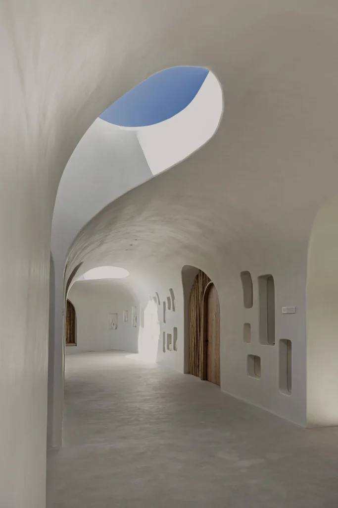 Οι καμάρες αναδιατυπώνονται όχι μόνο ως ανοίγματα, αλλά και ως περάσματα και στοιχεία επίπλωσης, ενώ οι εντοιχισμένες κατασκευές και η «τοπογραφία» του δαπέδου ενσωματώνουν κρεβάτια, νιπτήρες και χώρους καθιστικού σε μια συνεχή χωρική ακολουθία.