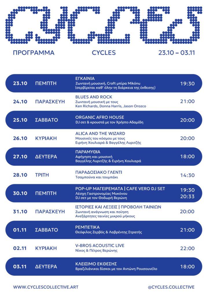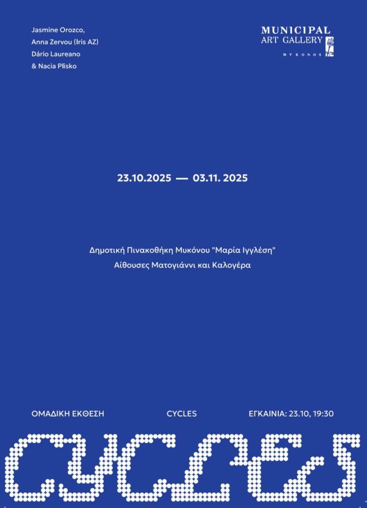 Το CYCLES παίρνει μορφή φεστιβάλ- με ζωντανή μουσική, εκδηλώσεις, αναγνώσεις, προβολές και πολλά ακόμη, η Χώρα Μυκόνου παίρνει ζωή. Η έκθεση λειτουργεί ως ένα κύκνειο άσμα του 2025, ολοκληρώνοντας το φετινό καλλιτεχνικό πρόγραμμα της Δημοτικής Πινακοθήκης Μυκόνου.