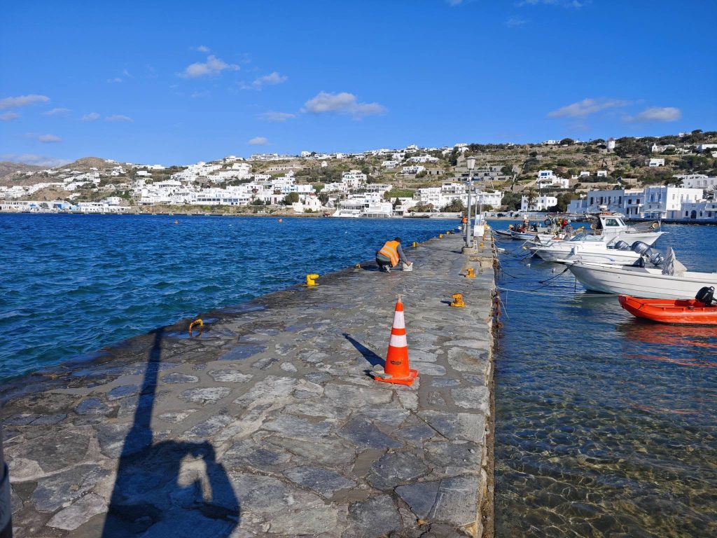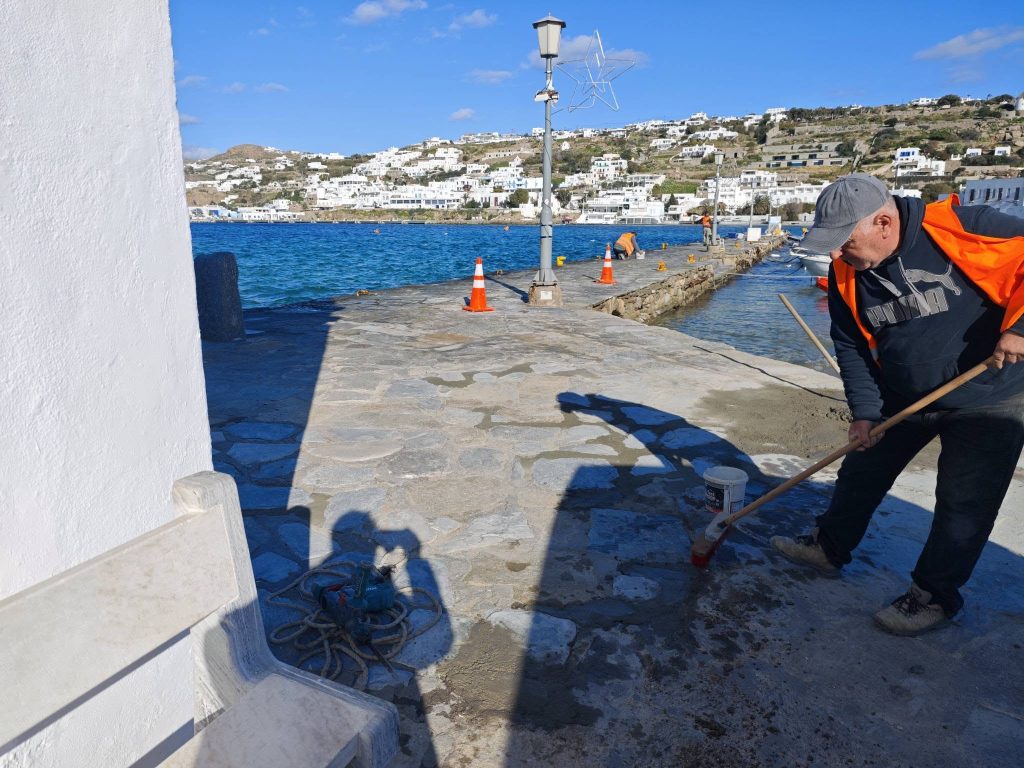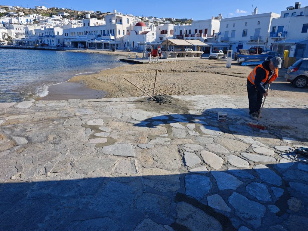 Εργασίες επισκευής, συντήρησης στο Μωλαράκι και στο Άι Νικολάκι τού πλακόστρωτου από το Λιμενικό Ταμείο Μυκόνου. Προετοιμασία εν όψει της εορτής των Θεοφανείων.