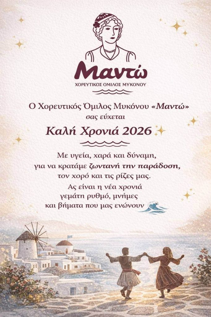 Ο Χορευτικό Όμιλος Μυκόνου “Μαντώ” εύχεται καλή χρονιά γεμάτη ρυθμό, μνήμες και βήματα που μας ενώνουν