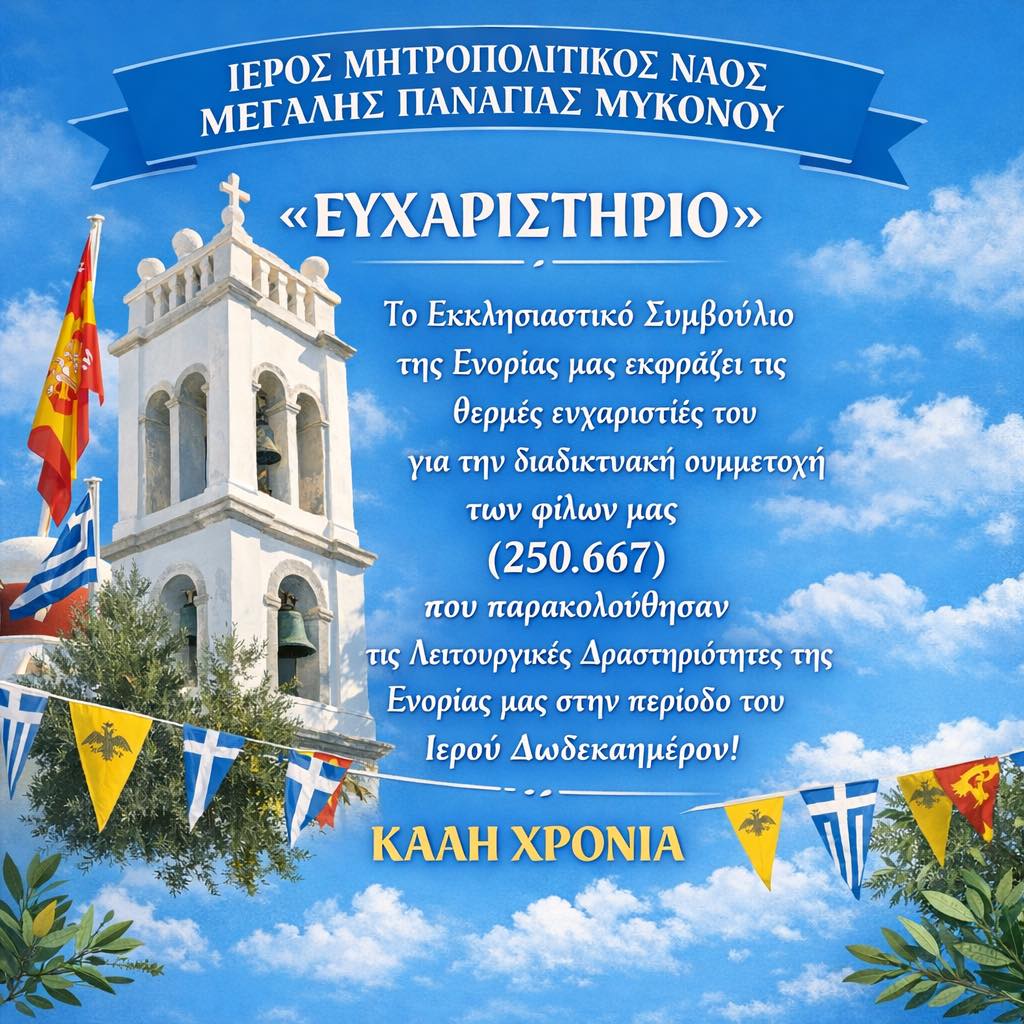 Το Εκκλησιαστικό Συμβόούλιο της Ενορίας Μεγάλης Παναγιά Μυκόνου, εκφράζει τις θερμές ευχαριστίες του για την διαδικτυακή συμμετοχή των φίλων μας (250. 667) που παρακολούθησαν τις Λειτουργικές Δραστηριότητες της Ενορίας μας στην περίοδο του Ιερού Δωδεκαημέρου!