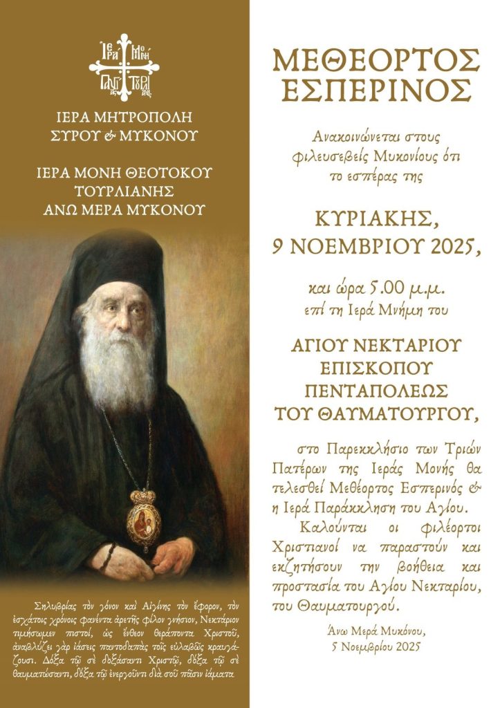 Καλούνται οι φιλέορτοι Χριστιανοί να παραστούν και εκζητήσουν την βοήθεια και προστάσια του Αγίου Νεκταρίου του Θαυματουργού.