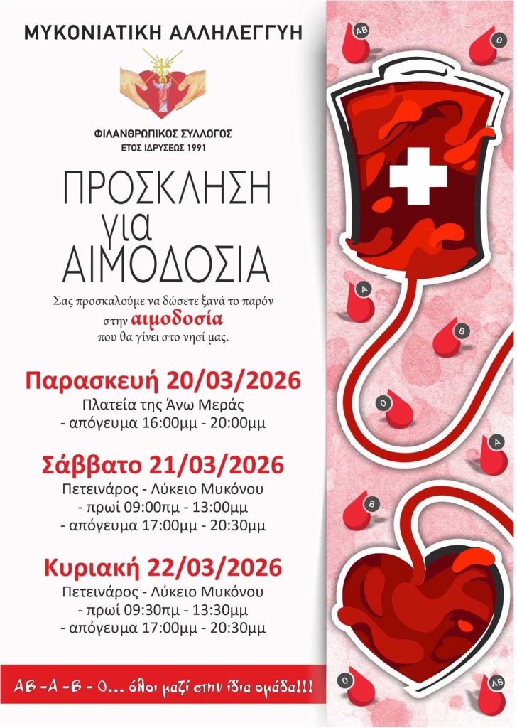 Σε μία ακόμη πρωτοβουλία κοινωνικής προσφοράς, ο Φιλανθρωπικός Σύλλογος «Μυκονιάτικη Αλληλεγγύη» καλεί τους κατοίκους του νησιού να συμμετάσχουν στην προγραμματισμένη αιμοδοσία, ενισχύοντας την προσπάθεια κάλυψης αναγκών σε αίμα.