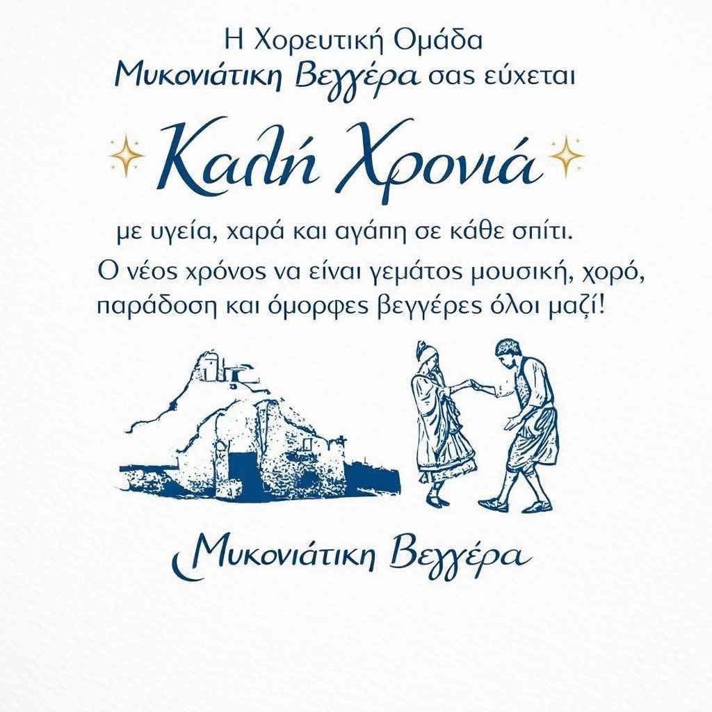 Το Βιωματικό Εργαστήρι Λαογραφίας και Παραδοσιακού χορού “Μυκονιάτικη Βεγγέρα” ευχήθηκε καλή χρονιά με μια γιορτινή κάρτα.
