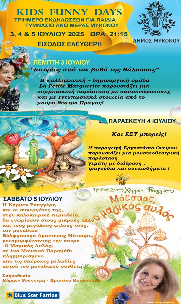 Η μοναδική Κάρμεν Ρουγγέρη και οι συνεργάτες της, στην καλοκαιρινή τους περιοδεία, θα γνωρίσουν στους μικρούς αλλά και τους μεγάλους φίλους τους τον μοναδικό Βολφκαντ Αμαντέους Μότσαρτ, μεταμορφώνοντας την όπερα “Ο Μαγικός Αυλός” σε ένα Μουσικό Παραμύθι πλημμυρισμένο από τις υπέροχες μελωδίες αυτού του μοναδικού συνθέτη. Σκηνοθεσία Κάρμεν Ρουγγέρη – Χριστίνα Κουλουμπή