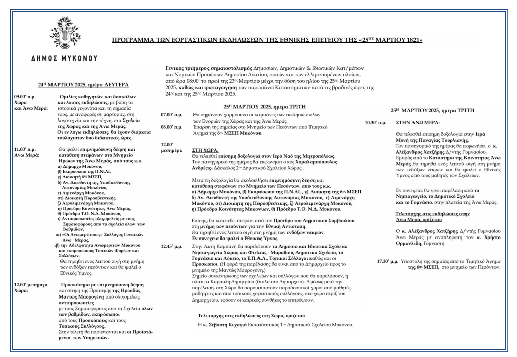 Το πρόγραμμα των εορταστικών εκδηλώσεων του Δήμου Μυκόνου της Εθνικής Επετείου 25η Μαρτίου 1821.