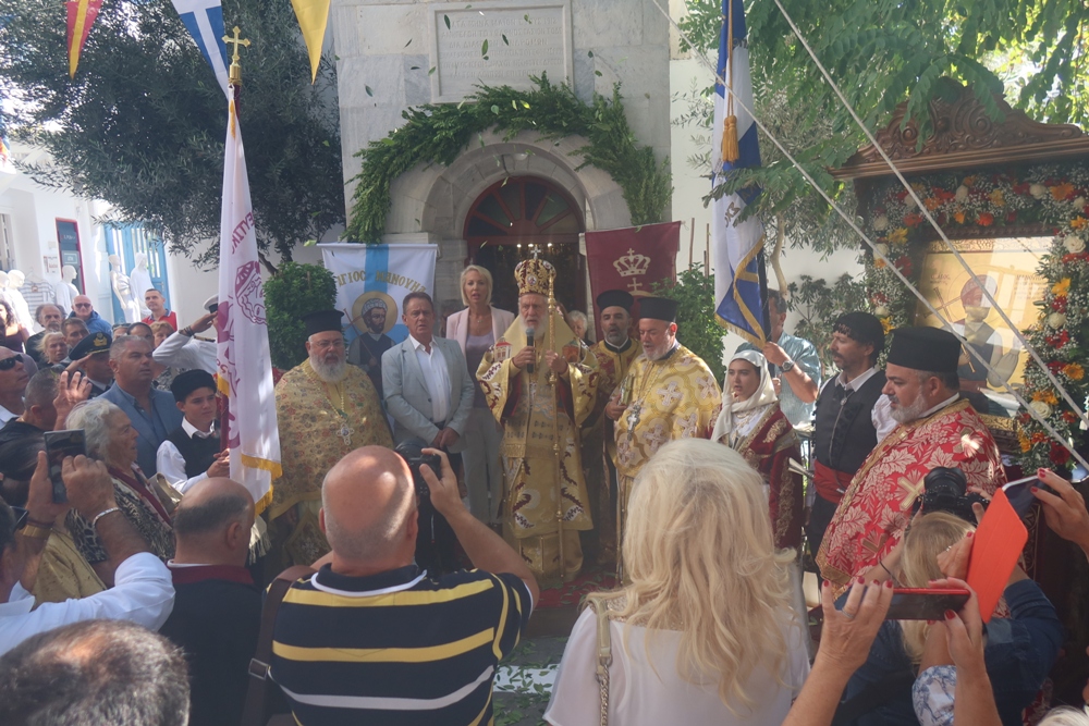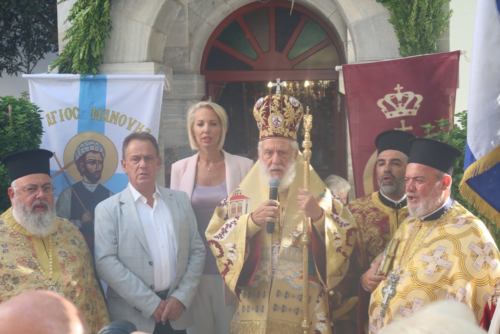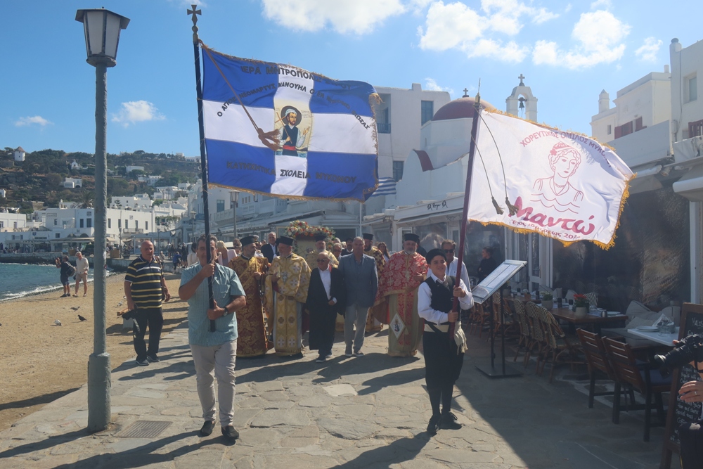 Ακολούθως, ο Σεβασμιώτατος κ. Δωρόθεος Β’ ετέθη επικεφαλής της λιτανείας της ιεράς εικόνος του Αγίου Νεομάρτυρος Μανουήλ, την οποία πλαισίωσαν Μέλη του Πολιτιστικού Συλλόγου “ΜΑΝΤΩ”, με παραδοσιακές ενδυμασίες και Κρήτες, οι οποίοι ζουν στη Μύκονο και κάθε χρόνο ιδιαιτέρως τιμούν το συντοπίτη τους Άγιο Μανουήλ.