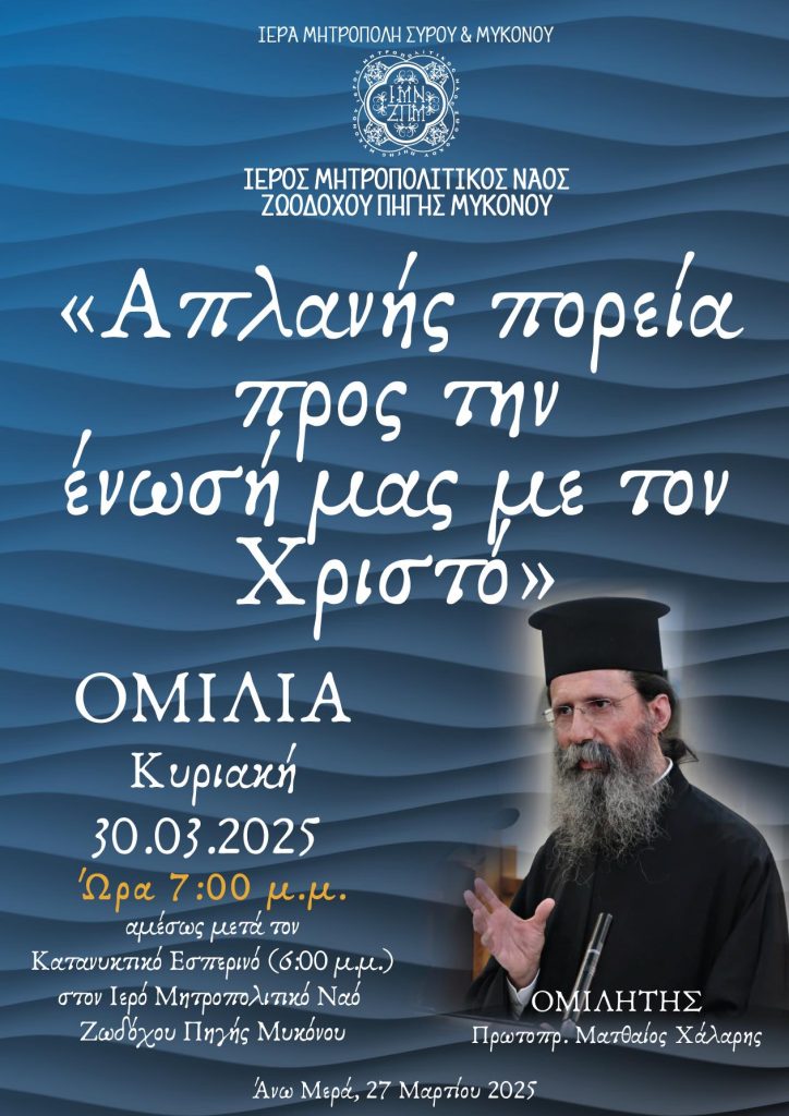 Η ομιλία θα πραγματοποιηθεί την Κυριακή 30/03 και ώρα 19:00, μετά από τον εσπερινό. Κεντρικό ομιλητής θα είναι ο Πρωτοπρ. Ματθαίος Χάλαρης.