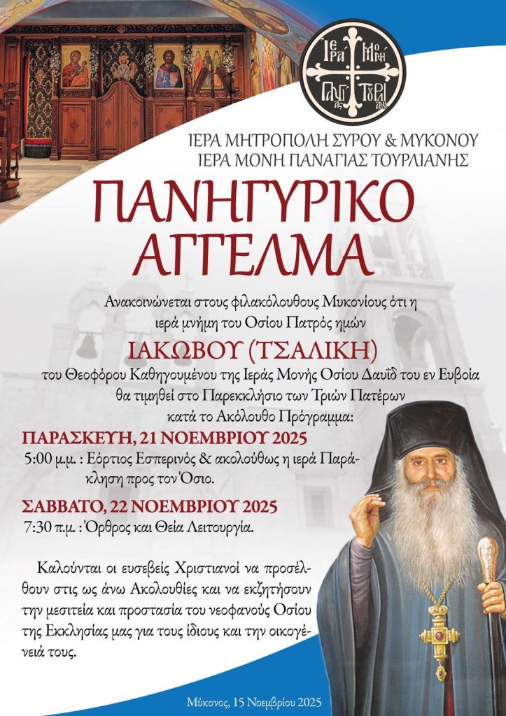 ΜΥΚΟΝΟΣΠΟΛΙΤΙΣΜΟΣ Πανηγυρικό Άγγελμα στην Ιερά Μονή Παναγίας Τουρλιανής By nickpapoutsas November 20, 2025 Το ιερό Πανηγυρικό Άγγελμα θα πραγματοποιηθεί κατά το Ακόλουθω Πρόγραμμα. Πανήγυρις Ζωοδόχου Πηγής στην Άνω Μερά – Το πρόγραμμα των εορτασμών Στη Μύκονο το 37ο EUPEA Forum για τη Φυσική Αγωγή και τη Συμπερίληψη «Emily in Paris» και Ελλάδα: Η Μύκονος στο κάδρο για τη νέα σεζόν Πόσο επηρεάζεται η Μύκονος από τον πόλεμο στη Μέση Ανατολή – Τι δείχνουν τα στοιχεία Ελληνικός τουρισμός: Οι τρεις καθοριστικοί παράγοντες για το 2026 – Στο 21% η συνολική συνεισφορά στο ΑΕΠ πέρυσι UBS: Οι Έλληνες είναι οι πιο σκληρά εργαζόμενοι στον ανεπτυγμένο κόσμο ΠροηγούμενοΔημιουργικά Χριστούγεννα με εκπαιδευτικά προγράμματα στο Μουσείο Κυκλαδικής ΤέχνηςΕπόμενοΟι δουλειές που θα γεννηθούν στην Ελλάδα τα επόμενα χρόνια TagsΜΥΚΟΝΟΣΠΟΛΙΤΙΣΜΟΣ ΔΕΙΤΕ ΕΠΙΣΗΣ Φλώριος Ασημομύτης: Η ένταση στη Μέση Ανατολή στρέφει το... ✒️ Άρθρο γνώμης του επιχειρηματία Φλώριου Ασημομύτη Η νέα περίοδος έντασης που διαμορφώνεται στη Μέση Ανατολή και το... Επιμελητήριο Κυκλάδων: Σεμινάρια Τεχνικού Ασφαλείας για εργοδότες Σε εξέλιξη μπαίνει ο προγραμματισμός των σεμιναρίων Τεχνικού Ασφαλείας για εργοδότες, που θα πραγματοποιηθούν στις Κυκλάδες μέσα... Κέντρο Υγείας Μυκόνου: Μια δημόσια δομή που στάθηκε στο... Ο κομβικός ρόλος της προέδρου της Διοικούσας Επιτροπής, Ντίνας Σαμψούνη. Η πορεία του Κέντρου Υγείας δεν υπήρξε εύκολη.... Έκοψε βασιλόπιτα ο Σύλλογος Εκπαιδευτικών στο Γενικό Λύκειο Μυκόνου Σε ζεστό και εορταστικό κλίμα πραγματοποιήθηκε η ευλογία της βασιλόπιτας του Συλλόγου Εκπαιδευτικών στο Γενικό Λύκειο Μυκόνου.... Καιρός: Η πρόγνωση για τη Μύκονο για σήμερα Τετάρτη Η Τετάρτη στη Μύκονο κυλά με καλό καιρό. Η νύχτα και το ξημέρωμα έχουν λίγες νεφώσεις, αλλά...