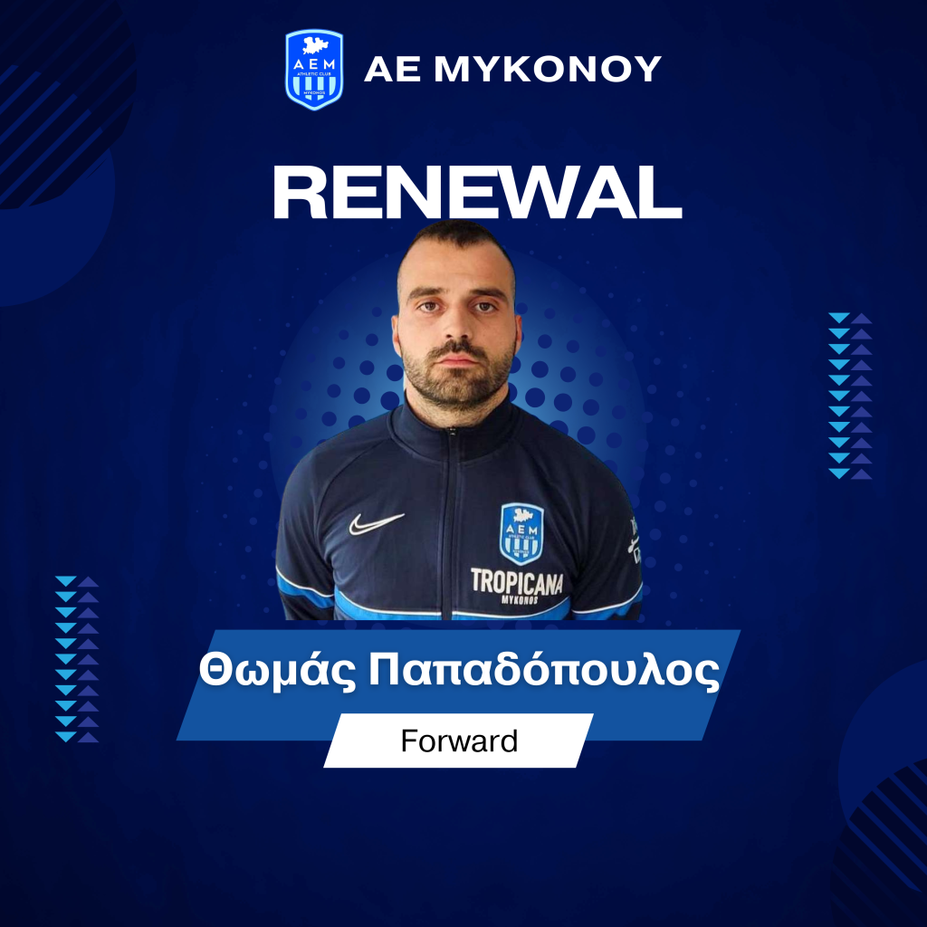 Η ΑΕ Μυκόνου είναι στην ευχάριστη θέση να ανακοινώσει την ανανέωση της συνεργασίας του με τον Θωμά Παπαδόπουλο, ο οποίος θα αγωνιστεί με τα χρώματα της ομάδας για μία ακόμα χρονιά.