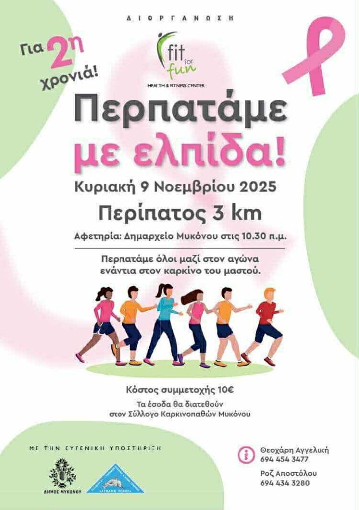 Ελάτε να περπατήσουμε και να στηρίξουμε το πολύτιμο έργο τoυ Συλλόγου Καρκινοπαθών και Φίλων Στήριξης Μυκόνου, “Δύναμη Ψυχής.”