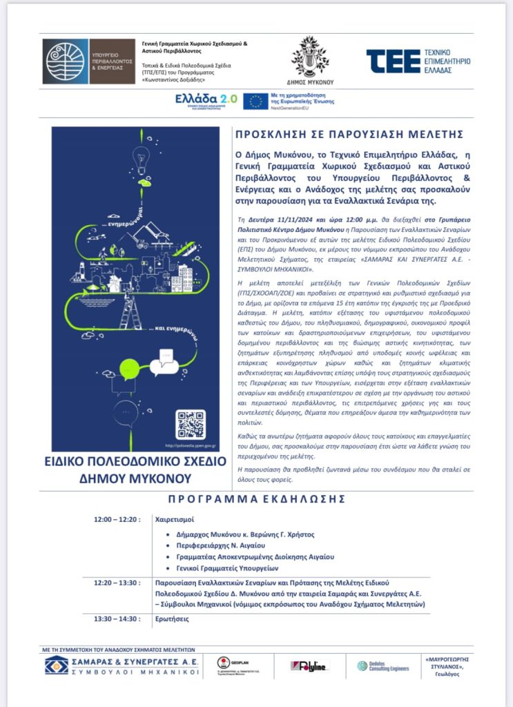Τη Δευτέρα 11/11/2024 και ώρα 12:00 μ.μ. θα διεξαχθεί στο Γρυπάρειο Πολιτιστικό Κέντρο Δήμου Μυκόνου η Παρουσίαση των Εναλλακτικών Σεναρίων και του Προκρινόμενου εξ αυτών της μελέτης Ειδικού Πολεοδομικού Σχεδίου (ΕΠΣ) του Δήμου Μυκόνου, εκ μέρους του νόμιμου εκπροσώπου του Ανάδοχου Μελετητικού Σχήματος, της εταιρείας «ΣΑΜΑΡΑΣ ΚΑΙ ΣΥΝΕΡΓΑΤΕΣ Α.Ε. – ΣΥΜΒΟΥΛΟΙ ΜΗΧΑΝΙΚΟΙ».