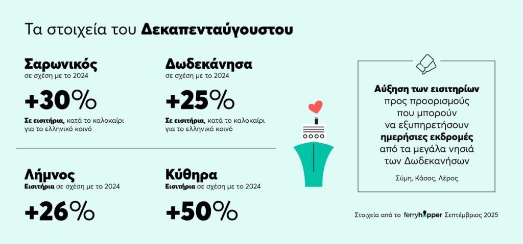 Τα στοιχεία του Ferryhopper δείχνουν επίσης ότι το τριήμερο του Δεκαπενταύγουστου αποτέλεσε το peak της φετινής σεζόν. Η μεγαλύτερη έξοδος καταγράφηκε το Σαββατοκύριακο πριν την αργία, ενώ οι επιστροφές κορυφώθηκαν τη Δευτέρα μετά το τριήμερο, στις 18 Αυγούστου. Αξίζει να αναφερθεί πως σημαντική κίνηση παρατηρήθηκε επίσης στις αρχές Ιουνίου και στο τελευταίο Σαββατοκύριακο του Ιουλίου