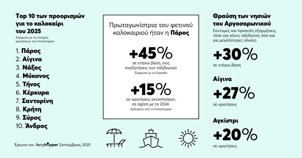 Τα νησιά των Κυκλάδων και του Αργοσαρωνικού κυριάρχησαν για άλλη μια φορά, ωστόσο πρωταγωνίστρια του φετινού καλοκαιριού ήταν η Πάρος. Σύμφωνα με το Expedia κατέγραψε αύξηση 45% σε ετήσια βάση στις αναζητήσεις των ταξιδιωτών, ενώ τα δεδομένα του Ferryhopper δείχνουν μια αύξηση των ακτοπλοϊκών κρατήσεων πάνω από 15%, σε σχέση με το 2024.