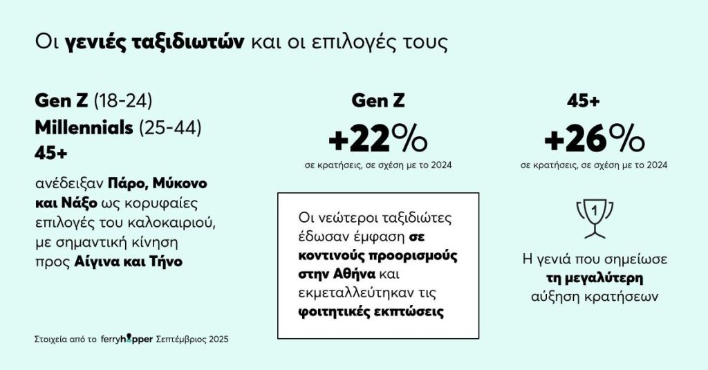 Πέρα από τις μεταβολές κρατήσεων και τις γεωγραφικές τάσεις, ιδιαίτερο ενδιαφέρον παρουσιάζει το πώς διαμορφώνονται οι προτιμήσεις ανά ηλικιακή ομάδα. Τα δεδομένα του Ferryhopper δείχνουν πως: