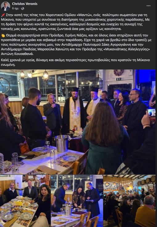 Ο δήμαρχος Μυκόνου, Χρήστος Βερώνης, έδωσε το παρών στην κοπή της πίτας του Χορευτικού Ομίλου «Μαντώ», στέλνοντας μήνυμα στήριξης σε έναν σύλλογο που κρατά ζωντανή τη μυκονιάτικη χορευτική παράδοση και ενισχύει τους δεσμούς της τοπικής κοινωνίας.