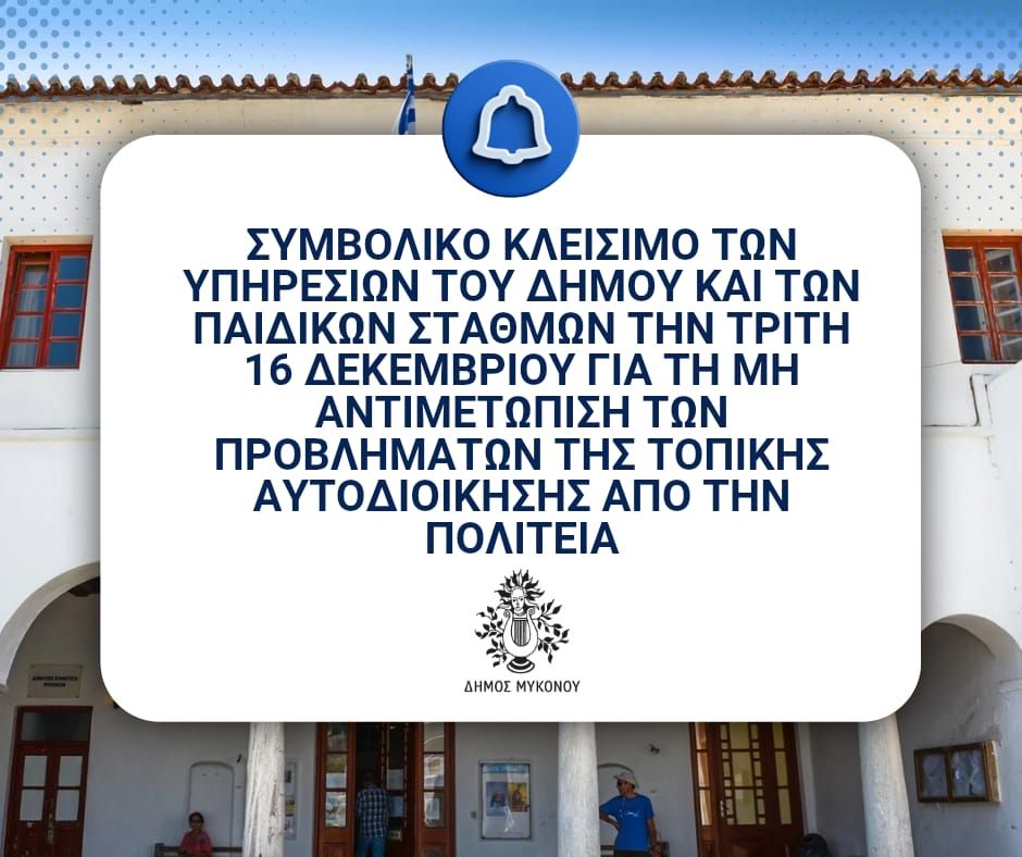 Σε υλοποίηση της απόφασης της Κεντρικής Ένωσης Δήμων Ελλάδος (ΚΕΔΕ), το Δημοτικό Συμβούλιο Μυκόνου με την υπ’ αριθ. 134/2025 απόφασή του προχωρά την Τρίτη, 16 Δεκεμβρίου στο συμβολικό κλείσιμο του συνόλου των υπηρεσιών του Δήμου και των παιδικών σταθμών.