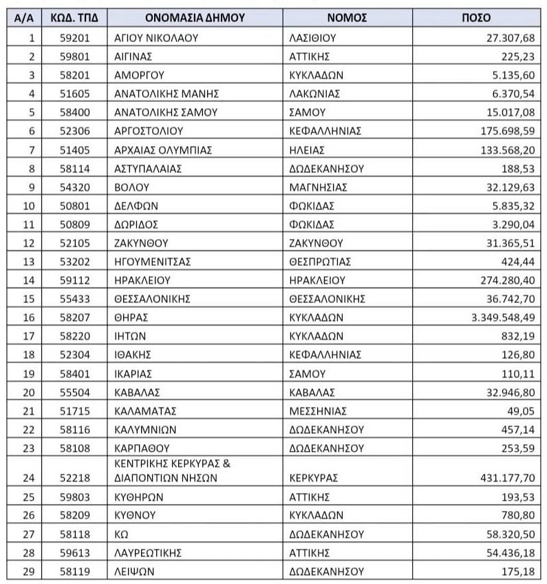 Με απόφαση του Υπουργού Εσωτερικών Θ. Λιβάνιου εγκρίνεται η χρέωση του λογαριασμού του Υπουργείου Εσωτερικών που τηρείται στο Ταμείο Παρακαταθηκών και Δανείων υπό τον τίτλο «Κάλυψη των πάσης φύσεως αναγκών των ΟΤΑ κ.λπ.», την επιχορήγηση συνολικού ποσού 9.775.519,24€ σε Δήμους της χώρας, από τα εισπραττόμενα έσοδα του τέλους κρουαζιέρας, για την κατασκευή και βελτίωση υποδομών τους καθώς και για την ενίσχυση του τουριστικού προϊόντος.