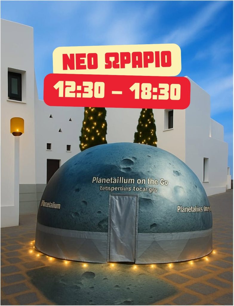 Μετά τις χθεσινές εντυπωσιακές προβολές, την παρατήρηση ουράνιων σωμάτων με το τηλεσκόπιο και τη γνωριμία με έναν αληθινό μετεωρίτη που ενθουσίασαν μικρούς και μεγάλους, το Planetarium On The Go προσαρμόζει το σημερινό του πρόγραμμα λόγω της κακοκαιρίας που πλήττει τη Μύκονο και του προληπτικού κλεισίματος των σχολείων.